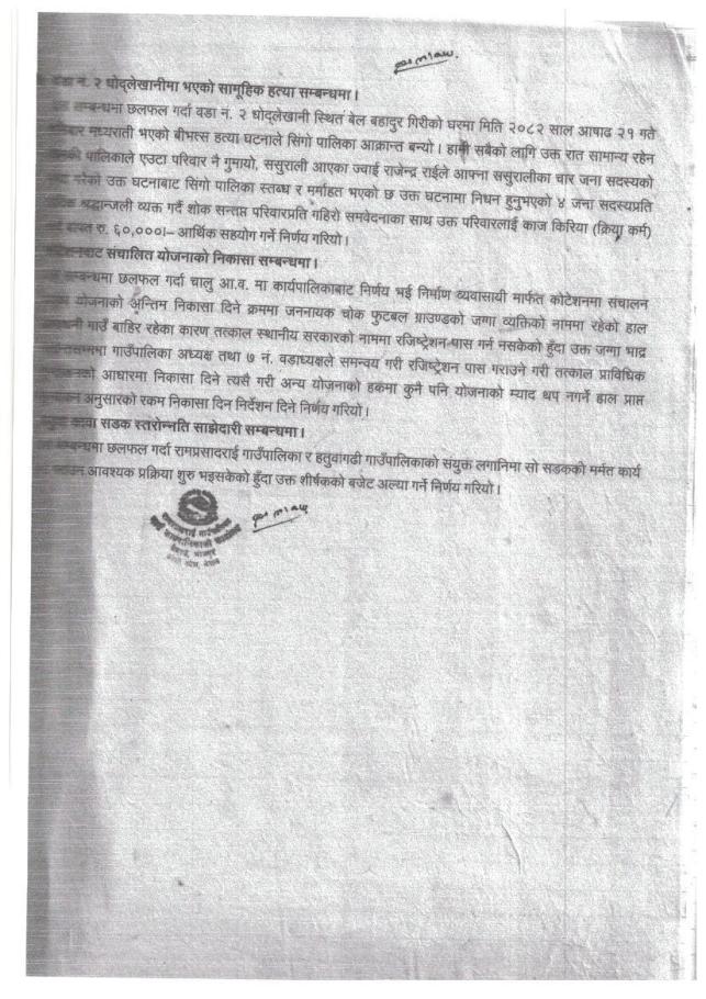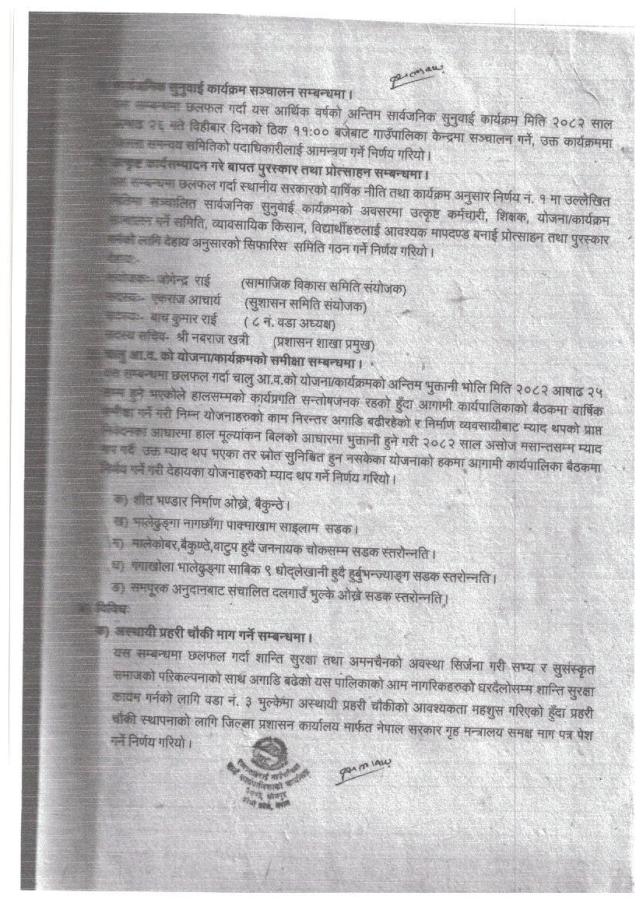गाउँ कार्यपालिकाको बैठकको निर्णयहरु- बैठक संख्या २० - मिति २०८२/०३/२४
