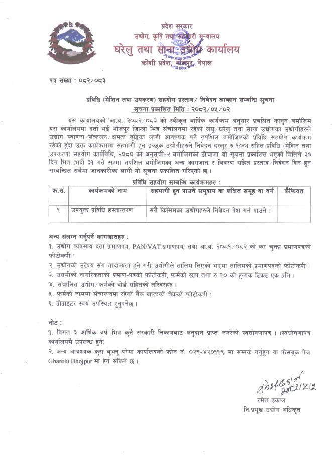 घरेलु तथा साना उधोग कार्यालय, कोशी प्रदेश, भोजपुरको प्रविधि (मेशिन तथा उपकरण) सहयोग प्रस्ताव / निवेदन आव्हान सम्बन्धि सूचना