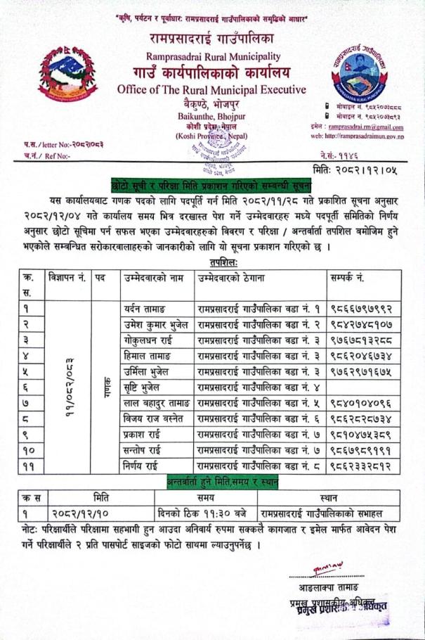छोटो सूची र परिक्षा मिति प्रकाशन गरिएको सम्बन्धी सूचना ।