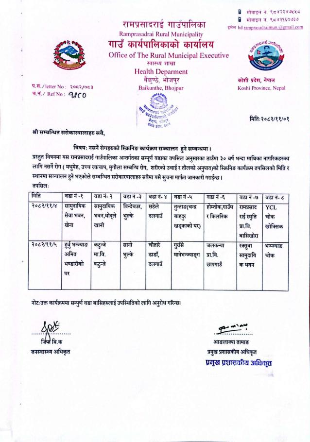 नसर्ने रोगहरुको स्क्रिनिङ कार्यक्रम सञ्चालन हुने सम्बन्धमा ।