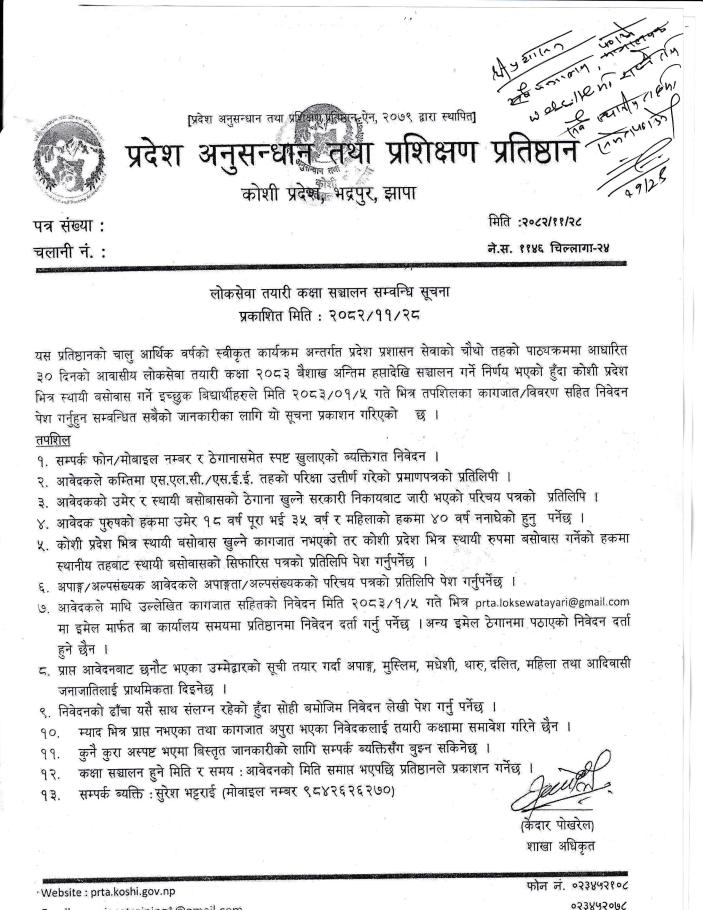 प्रदेश अनुसन्धान तथा प्रशिक्षण, कोशी प्रदेश, भद्रपुर, झापाको लोकसेवा तयारी कक्षा सञ्चालन सम्वन्धि सूचना ।
