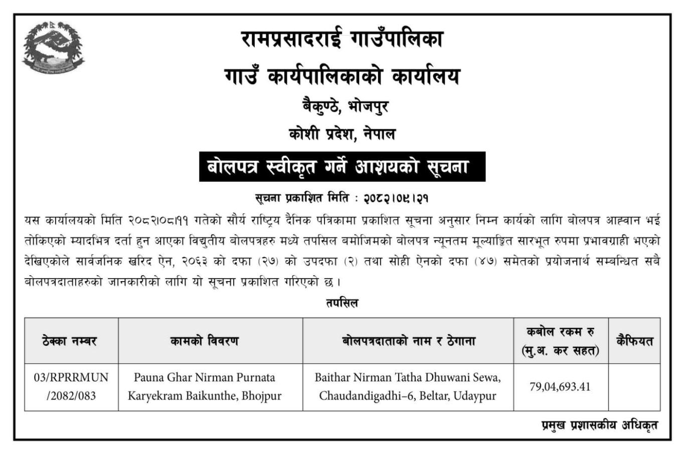 » बोलपत्र स्वीकृत गर्ने आशयको सूचना