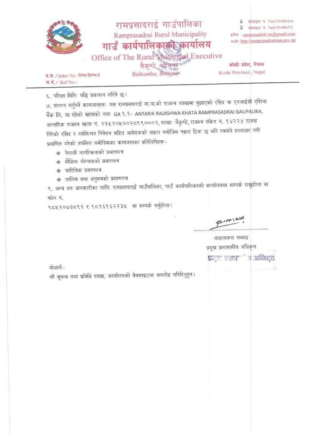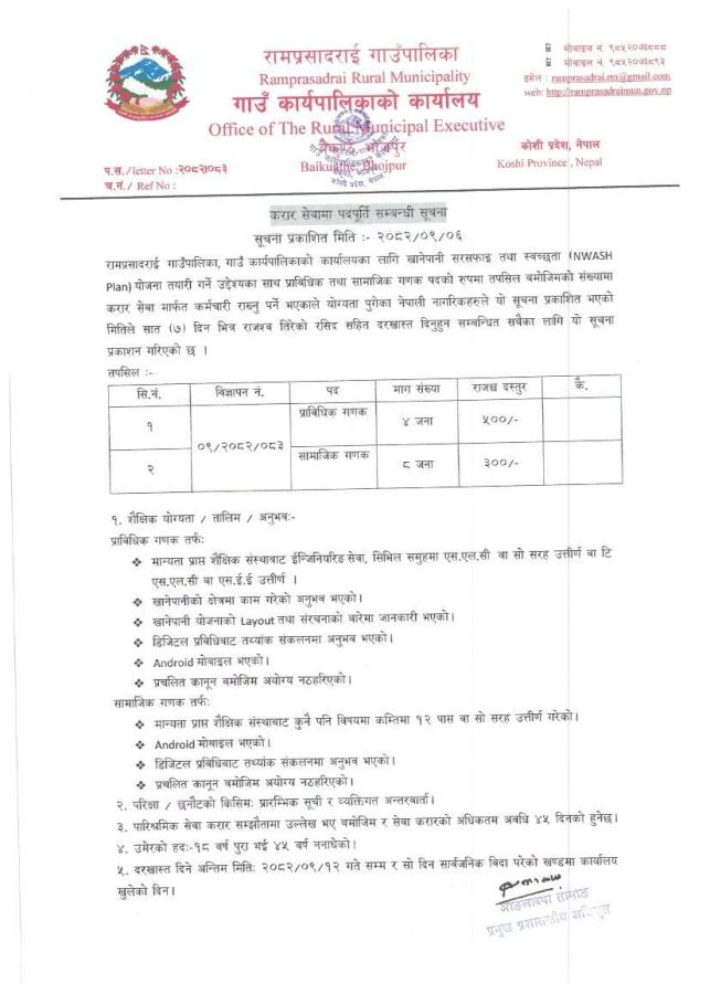 रामप्रसादराई गाउँपालिका, गाउँ कार्यपालिकाको कार्यालयका लागि खानेपानी सरसफाइ तथा स्वच्छता योजना (NWASH Plan) तयारी गर्ने उद्देश्यका साथ प्राविधिक तथा सामाजिक गणक पद करार सेवामा पदपूर्ति गर्ने सम्बन्धी सूचना ।