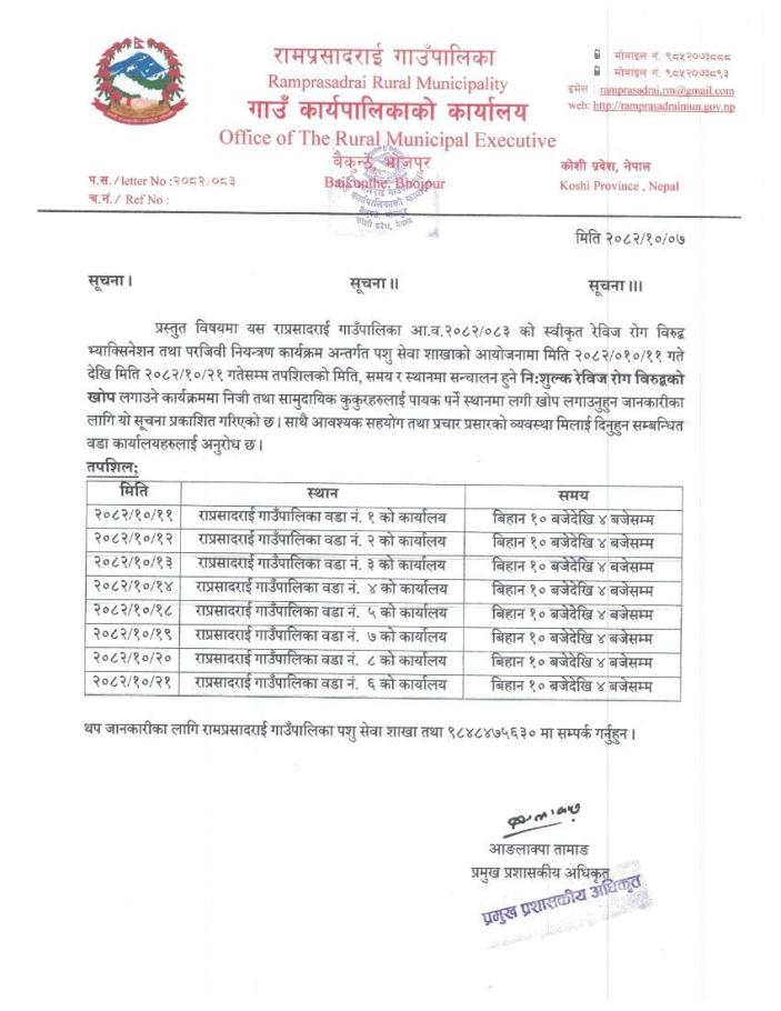 रेविज रोग विरुद्ध भ्याक्सिनेशन तथा परजिवी नियन्त्रण कार्यक्रम सम्बन्धी सूचना ।