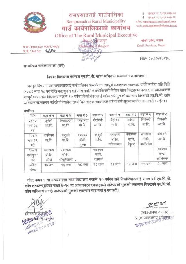विद्यालय केन्द्रित एच.पि.भी. खोप अभियान सञ्चालन सम्बन्धमा ।