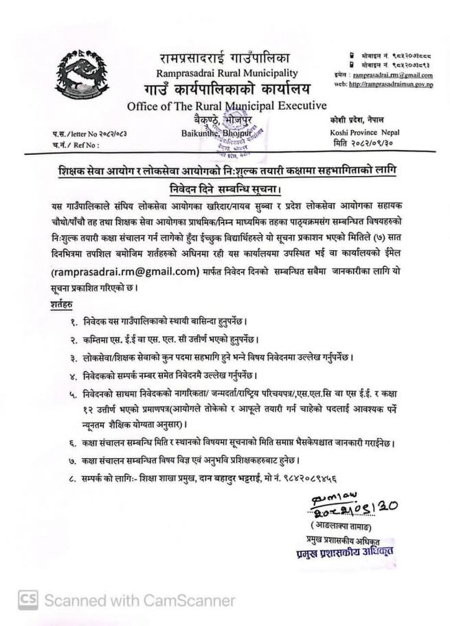 शिक्षक सेवा आयोग र लोकसेवा आयोग नि: शुल्क तयारी कक्षा सहभागिताको लागि निवेदन दिने सम्बन्धि सूचना।