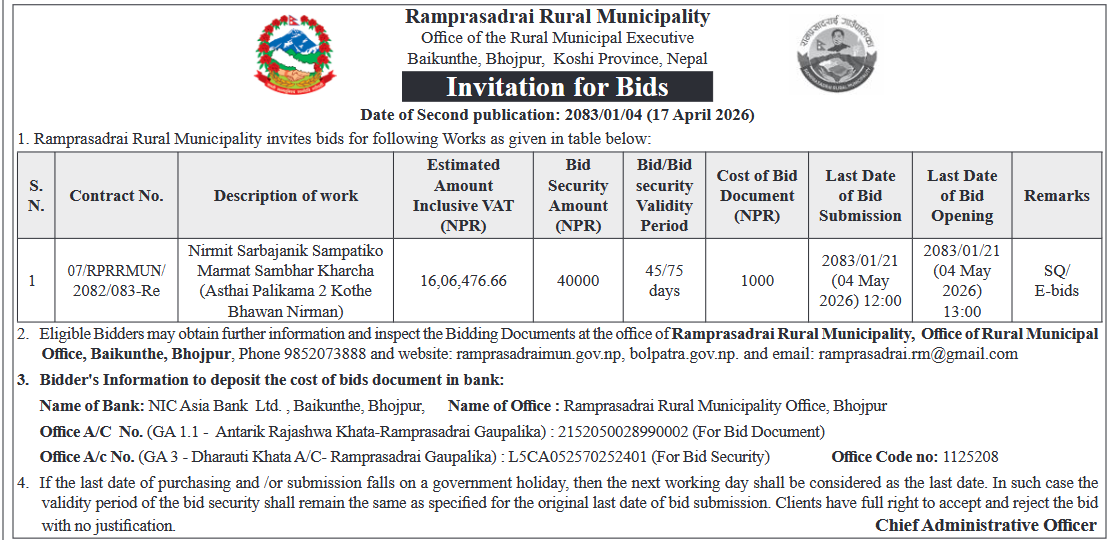 Invitation for Bids Of Nirmit Sarbajanik Sampatiko Marmat Sambhar Kharcha(Asthai Palikama 2 Kothe Bhawan Nirman)