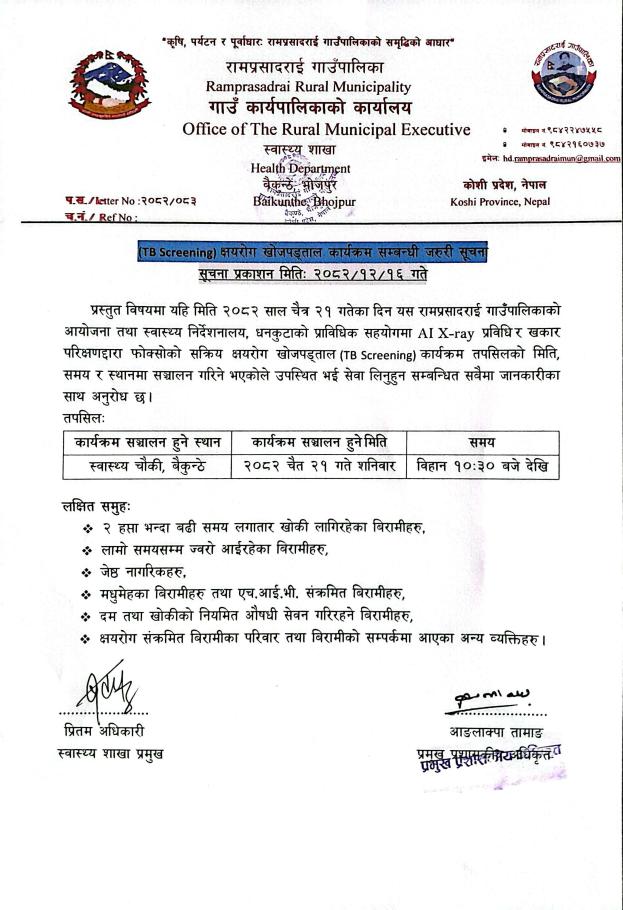 (TB Screening) क्षयरोग खोजपड्ताल कार्यक्रम सम्बन्धी जरुरी सूचना