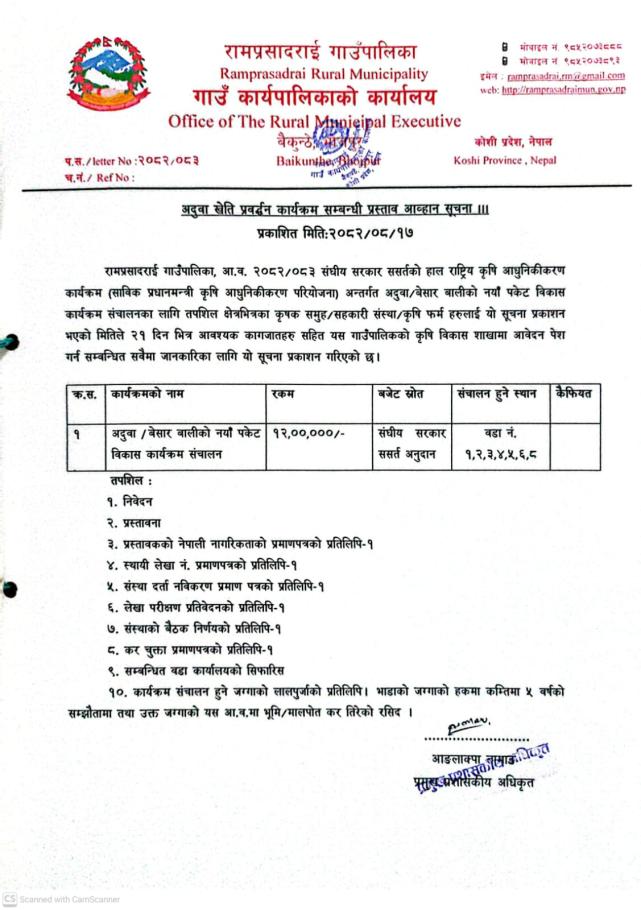 » अदुवा खेति प्रवर्द्धन कार्यक्रम सम्बन्धी प्रस्ताव आव्हान सूचना ।
