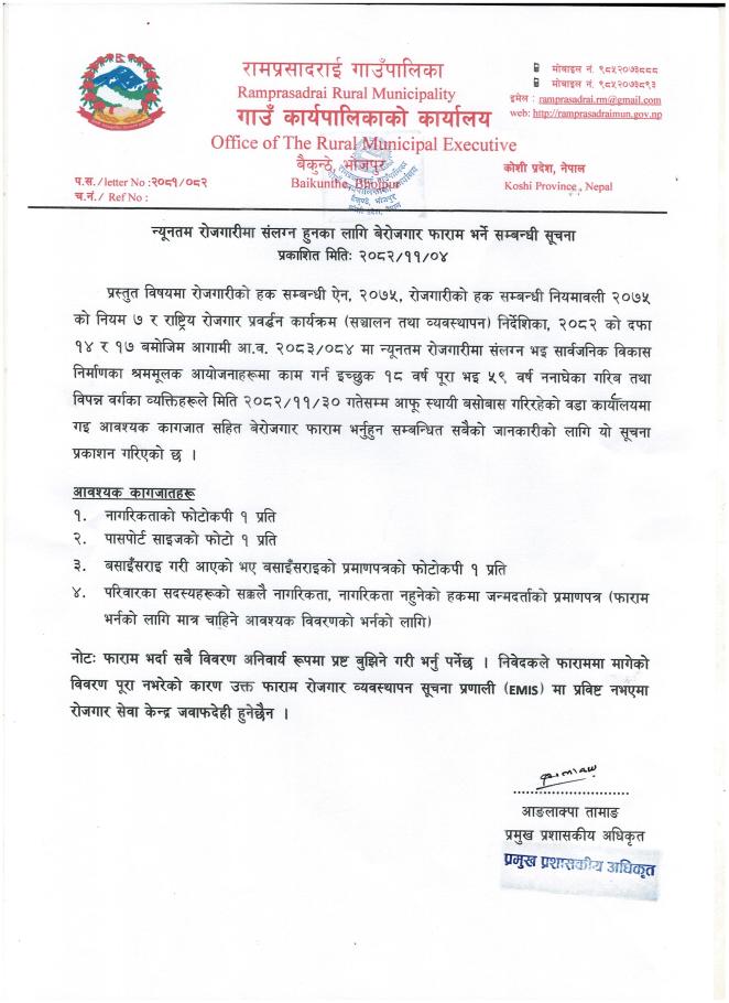 न्यूनतम रोजगारीमा संलग्न हुनका लागि बेरोजगार फाराम भर्ने सम्बन्धी सूचना