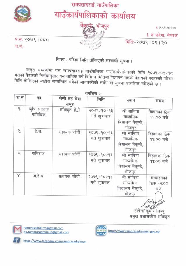परिक्षा मिति तोकिएको सम्बन्धी सूचना ।