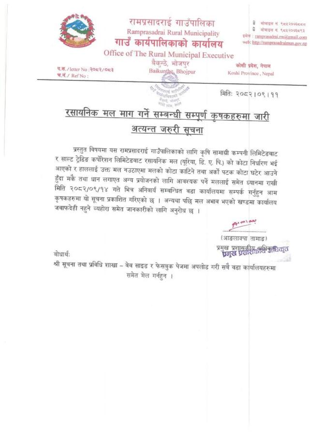 रसायनिक मल माग गर्ने सम्बन्धी सम्पूर्ण कृषकहरुमा जारी अत्यन्त जरुरी सूचना ।
