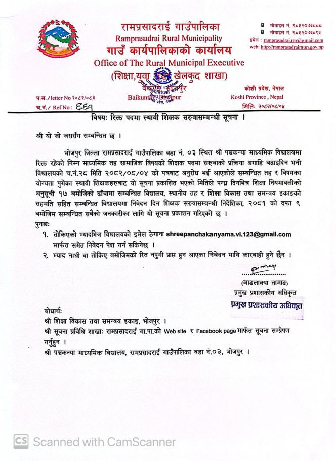 रिक्त पदमा स्थायी शिक्षक सरुवासम्बन्धी सूचना ।