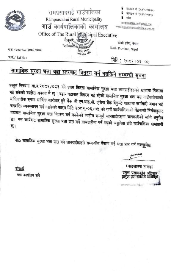 सामाजिक सुरक्षा भत्ता वडा स्तरबाट वितरण गर्न नसकिने सम्बन्धी सूचना