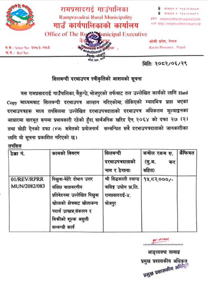 सिलबन्दी दरभाउपत्र स्वीकृतिको आशयको सूचना